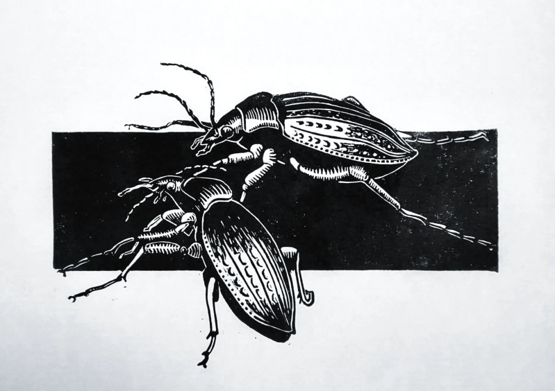 Insecten hebben hebben grafische kracht: de gelede poten, de voelsprieten en de ogen. Loopkevers hebben daarbovenop nog een geribbeld rugschild.