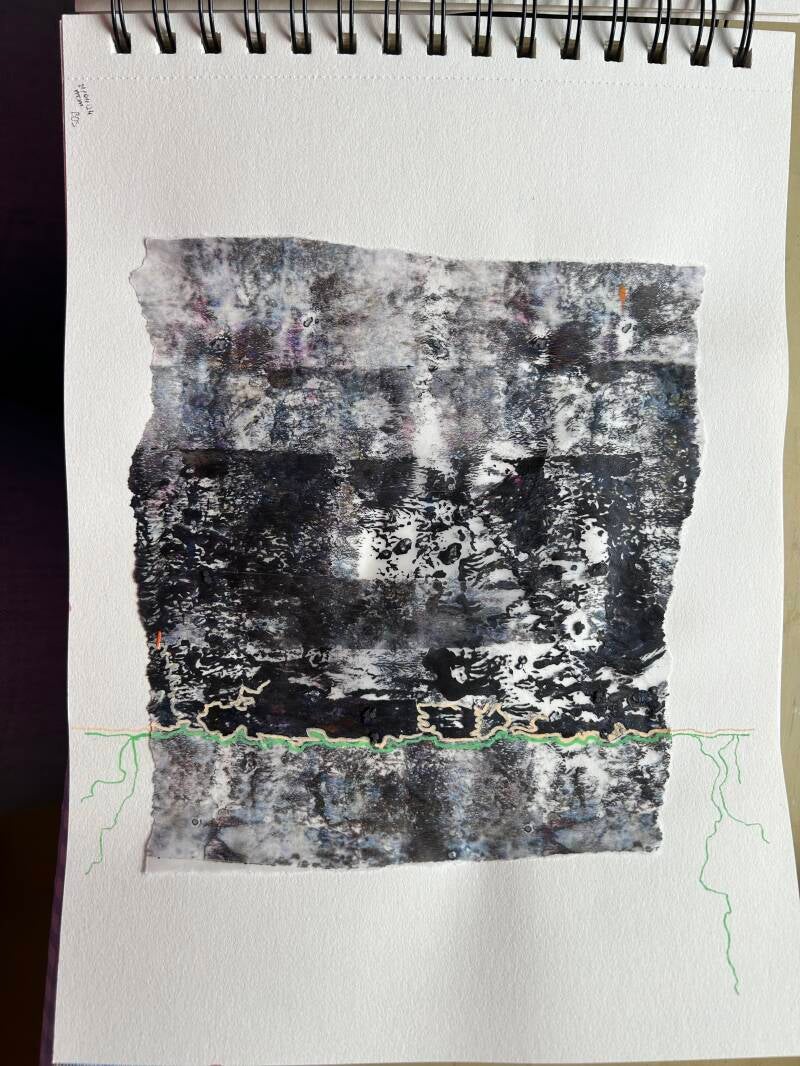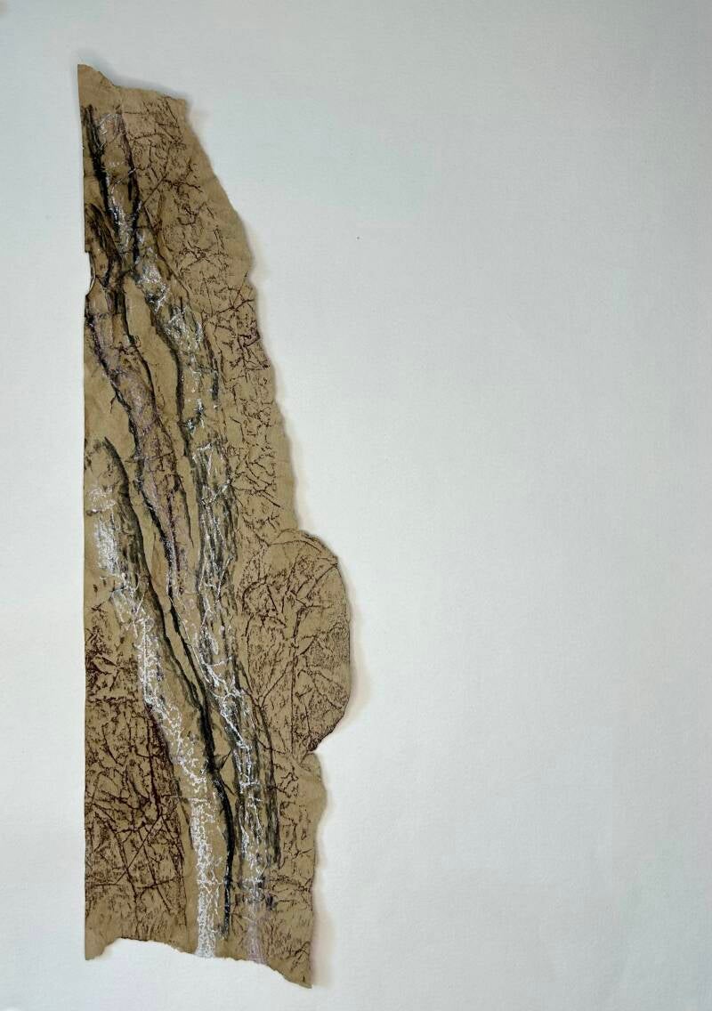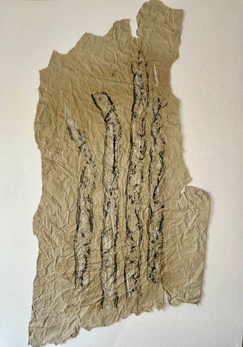 Plooi, ribbel & kreuk: houtskool en krijt op pakpapier. Ondergrond is een oude staldeur met klimop.